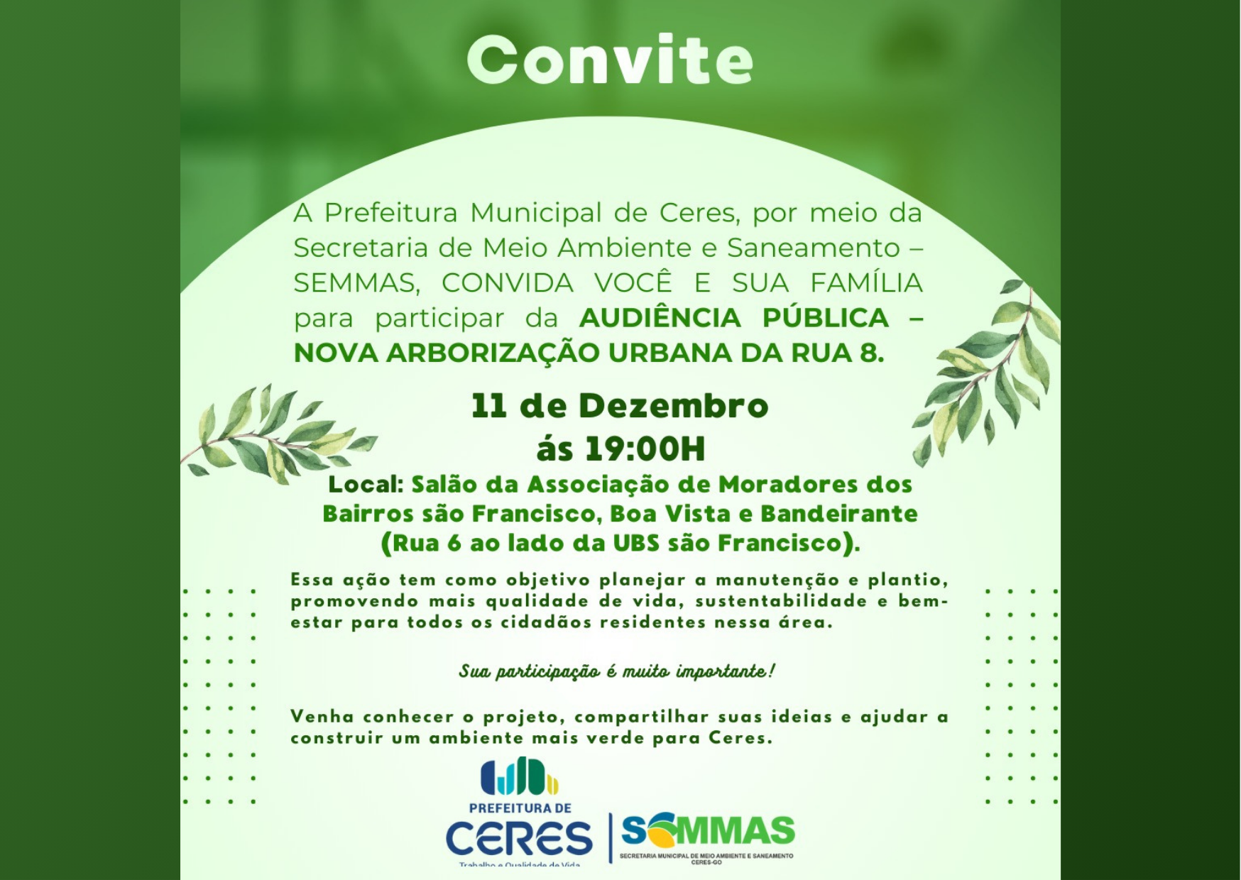 A Prefeitura de Ceres, por meio da Secretaria Municipal de Meio Ambiente e Saneamento, realizará nesta quinta-feira, 11 de dezembro, às 19h, uma audiência pública voltada ao planejamento da nova arborização urbana da Rua 8.