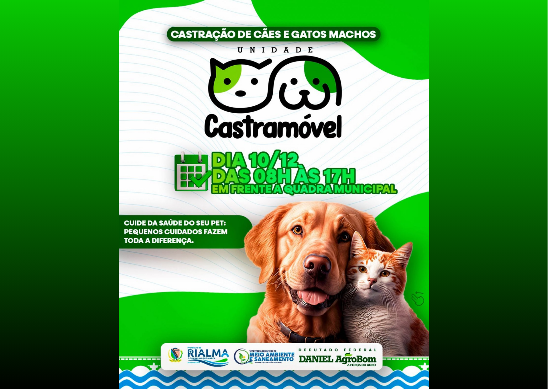 A Prefeitura de Rialma, por meio da Secretaria Municipal de Meio Ambiente e Saneamento, realiza amanhã, 10 de dezembro, das 08h às 17h, mais uma ação de castração de cães e gatos machos. O atendimento será realizado em frente à Quadra Municipal.