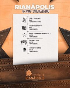 As atividades, organizadas pela Prefeitura Municipal de Rianápolis, terão início logo pela manhã. Às 8h, acontece a saída da cavalgada, com concentração na Fazenda Beira Caxiê, tradição que marca as comemorações do aniversário da cidade.