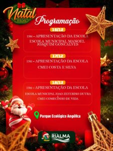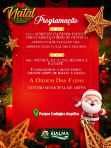 O Natal Encantado de Rialma reforça a valorização da cultura, da educação e dos talentos locais, convidando a comunidade a participar das apresentações e vivenciar o clima de esperança e confraternização no Parque Ecológico Angélica.