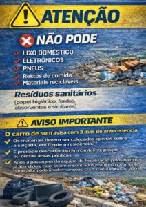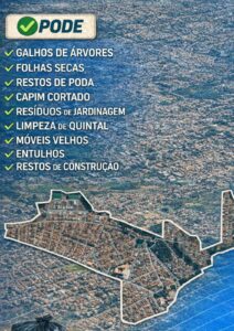 Conforme divulgado pela administração municipal, os moradores podem disponibilizar para coleta galhos de árvores, folhas secas, restos de poda, capim cortado, resíduos de jardinagem, materiais provenientes de limpeza de quintal, móveis inservíveis, além de entulhos e restos de construção civil.