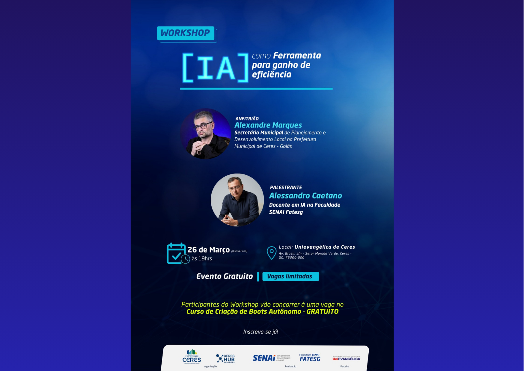 A Prefeitura de Ceres, por meio da Secretaria Municipal de Planejamento e Desenvolvimento Local, realiza nesta quinta-feira (26) um workshop gratuito voltado ao uso da inteligência artificial como ferramenta para ganho de eficiência.