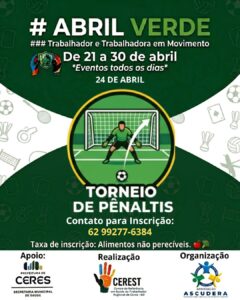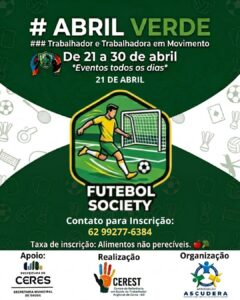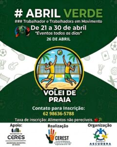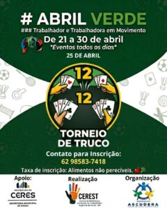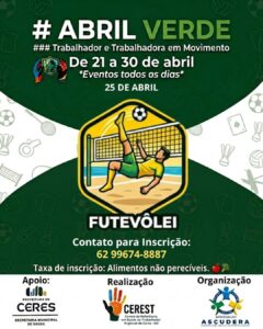 A Prefeitura de Ceres, por meio da Secretaria Municipal de Saúde e do Centro de Referência em Saúde do Trabalhador (CEREST), realiza entre os dias 21 e 30 de abril a programação do Abril Verde, com foco na promoção da saúde e bem-estar dos trabalhadores do município.