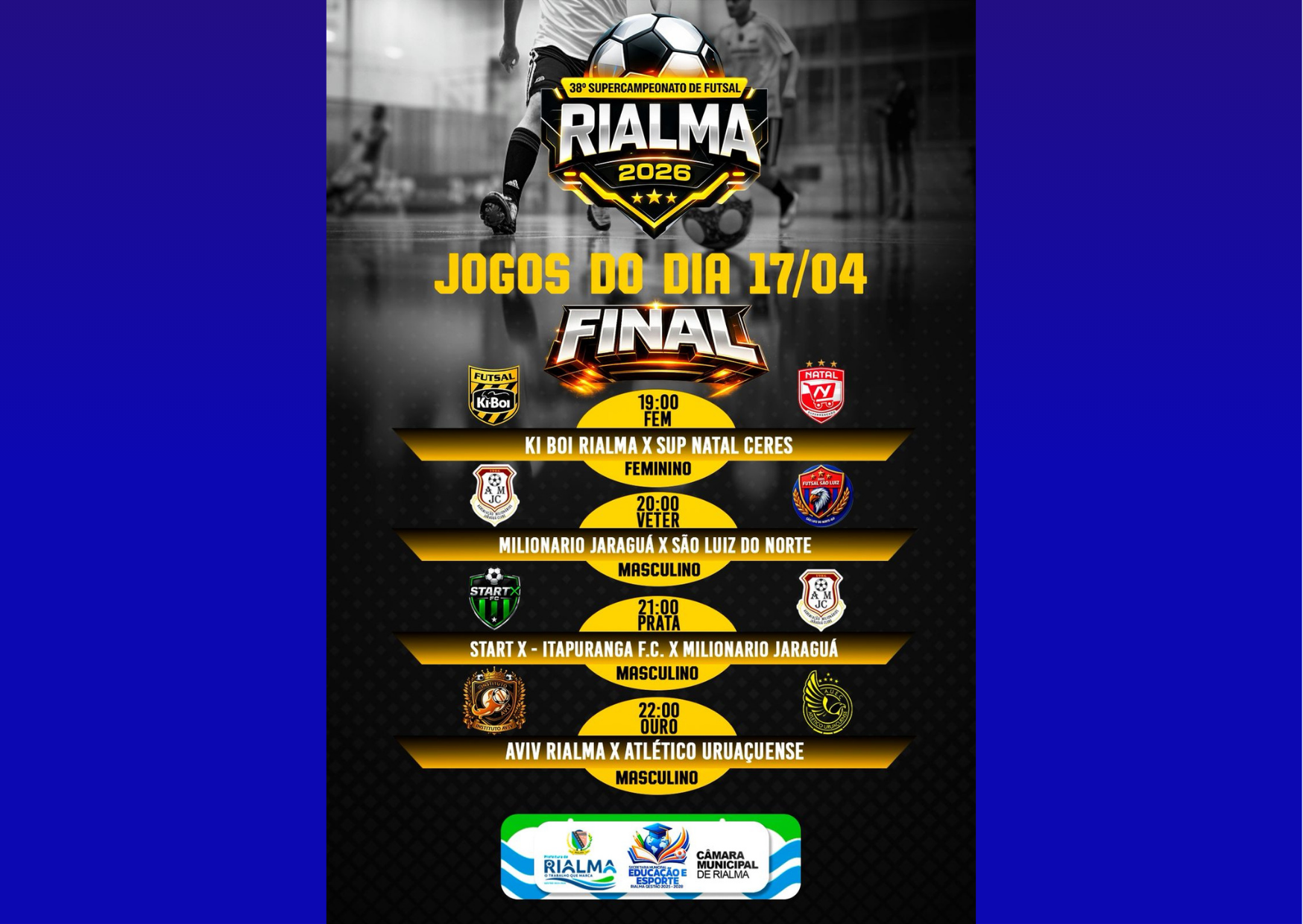 A Prefeitura de Rialma, por meio da Secretaria Municipal de Educação e Esporte, realiza nesta sexta-feira (17) a grande final do 38º Supercampeonato de Futsal de Rialma 2026, reunindo equipes de destaque da região em uma noite decisiva no ginásio municipal.