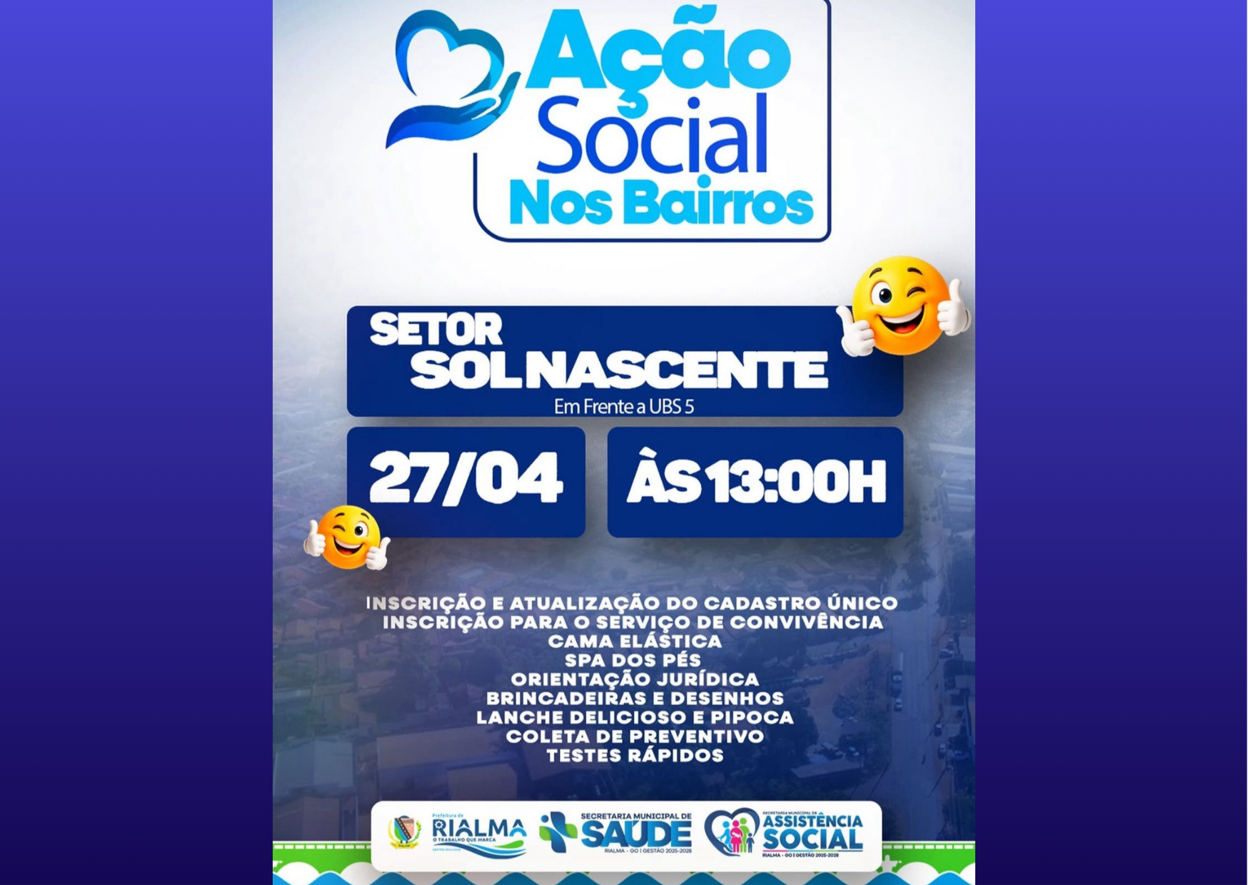 A população de Rialma tem um compromisso importante nesta segunda-feira (27). A ação “Ação Social nos Bairros” será realizada no Setor Sol Nascente, em frente à UBS 5, a partir das 13h, oferecendo uma série de atendimentos e atividades gratuitas voltadas para toda a família.