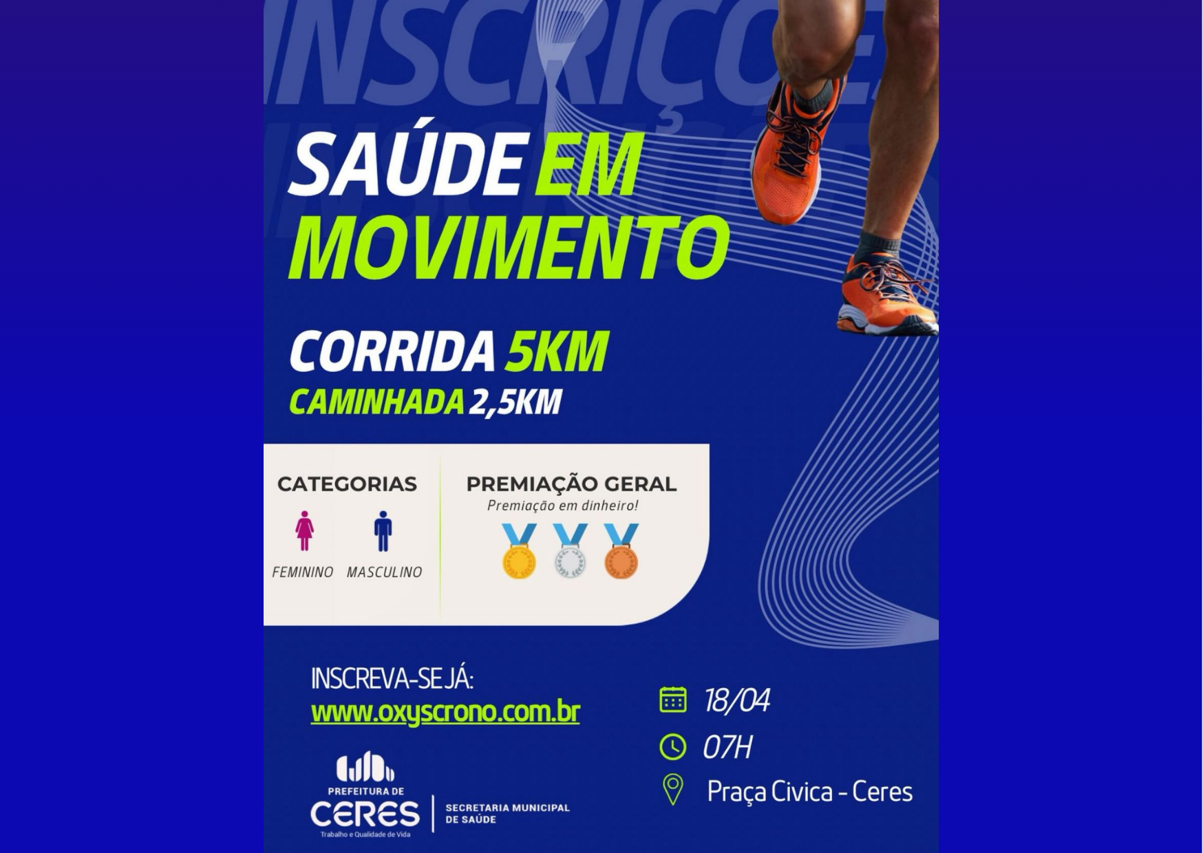 Ceres promove corrida “Saúde em Movimento” com percurso de 5 km e caminhada de 2,5 km: inscreva-se